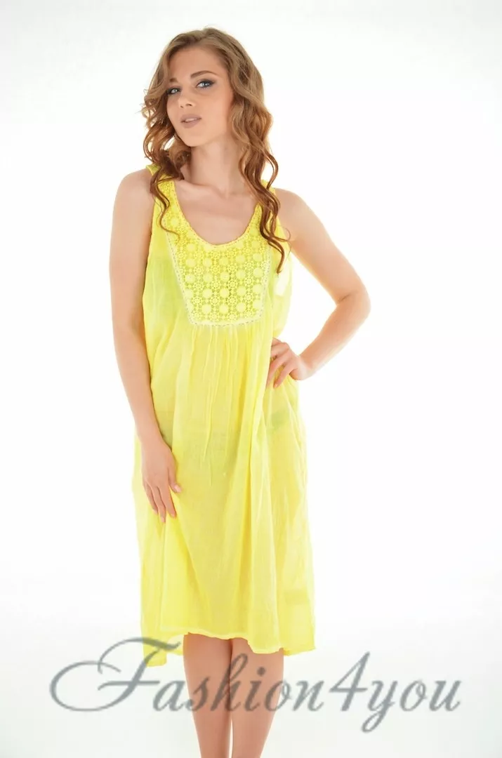 Модель из 100% котона с округлым вырезом по горловине, сарафан ровный по силуэту слегка расклешенный по низу Длина изделия ниже колен. Украшен сарафан ажурной вставкой по бюсту.